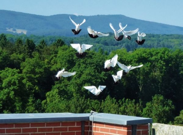 Nun wieder zu den Jungen. In den ersten fünf Tage haben sie im Flugschlag (F.Schl.) die Möglichkeit die Umgebung wahrzunehmen. Am sechsten /siebten u. achten Tag setze ich sie auf den Flugschlag, nun müssen sie aufs Flugbrett springen und durch die Fanggabeln in den F:Schl. kommen. Danach gehe ich in den nächsten zwei Tagen mit ihnen im Korb aufs Dach (Flachdach) meistens ist eine oder zwei Alttauben dabei, dann öffne ich den Korb. Im Idealfall sind sie in 20 Min. im F.Sch. ich habe aber auch schon 6 Std. gewartet. Von nun an werden sie immer direkt aus dem F. Schl. gestartet.