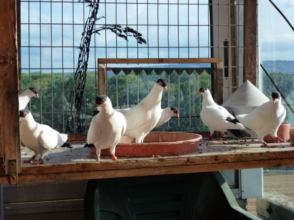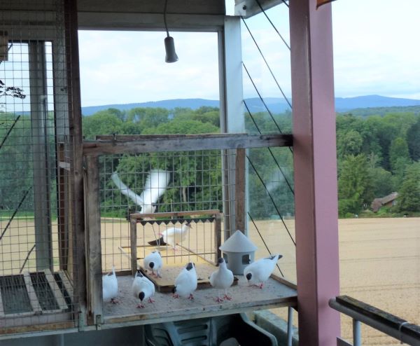 Wenn die alten Täubinnen wieder zum Training kommen, dann lasse ich sie beim Zuchtschlag frei und sie fliegen einige Zeit über dem Haus beim Flugschlag. Sind sie gelandet, wird das Flugbrett montiert und sie kommen vorsichtig in den Flugschlag. Im Zuchtschlag können sie in die Voliere, trotzdem ist in den 10 Jahren noch nie eine Kalotte beim Zuchtschlag gelandet.