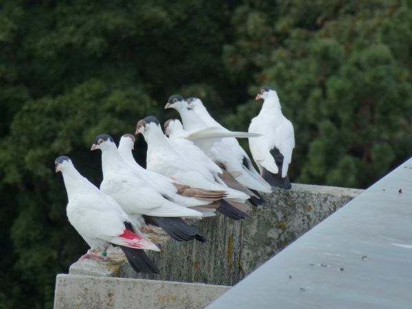 Die Tauben warten, auf ihrem Landeplatz, dass das Flugbrett erscheint.