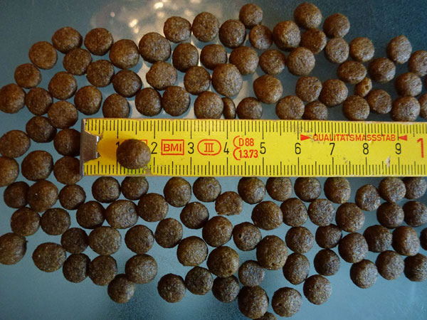So I informed myself about cat and dog kibble. Cat kibble have around 31& of crude protein and 17,5% of crude fat. Often dog kibble has less crude protein. In my opinion the biggest problem is the size of the kibble. Dog kibble is often biger than cat kibble, the cat kibble comes in a variety of shapes. There are star shapes ones, cross shaped ones and ring-shaped ones, those are not really ideal for the pigeons. After a long search I found ball shaped ones with 1cm diameter, which after an adaptation phase they eat quite well. My pigeons get cat kibble twice a week.